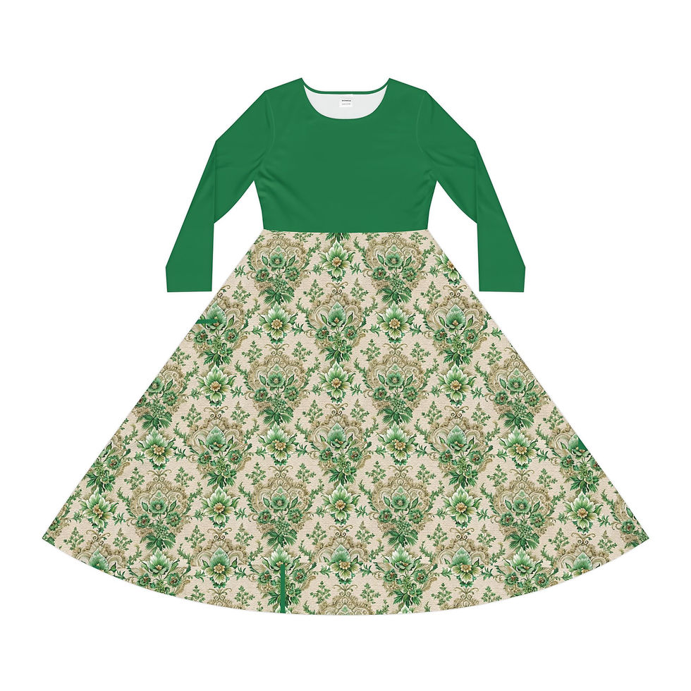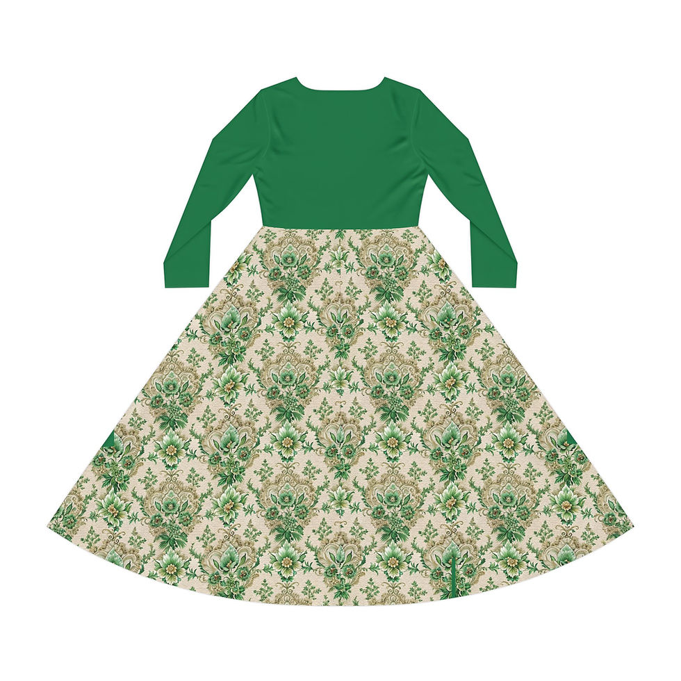 Green Embroidered Look Damask Long Sleeve Dress — Vintage Floral Circle Skirt