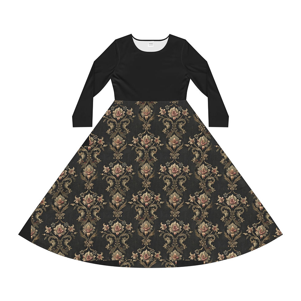 Vintage Embroidered Look Damask Long Sleeve Dress — Black & Gold Swirl Skirt